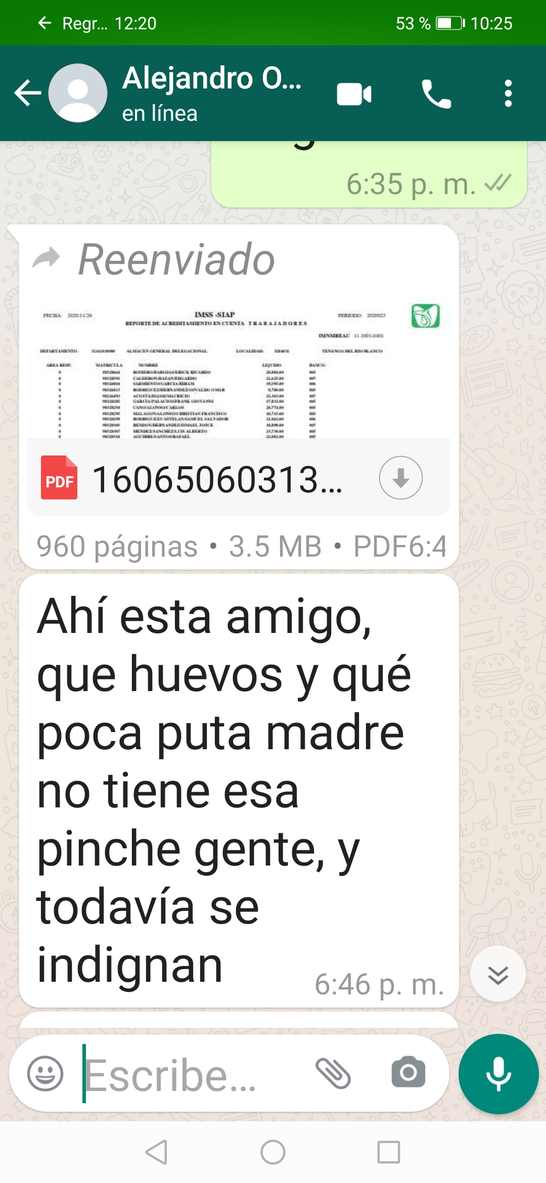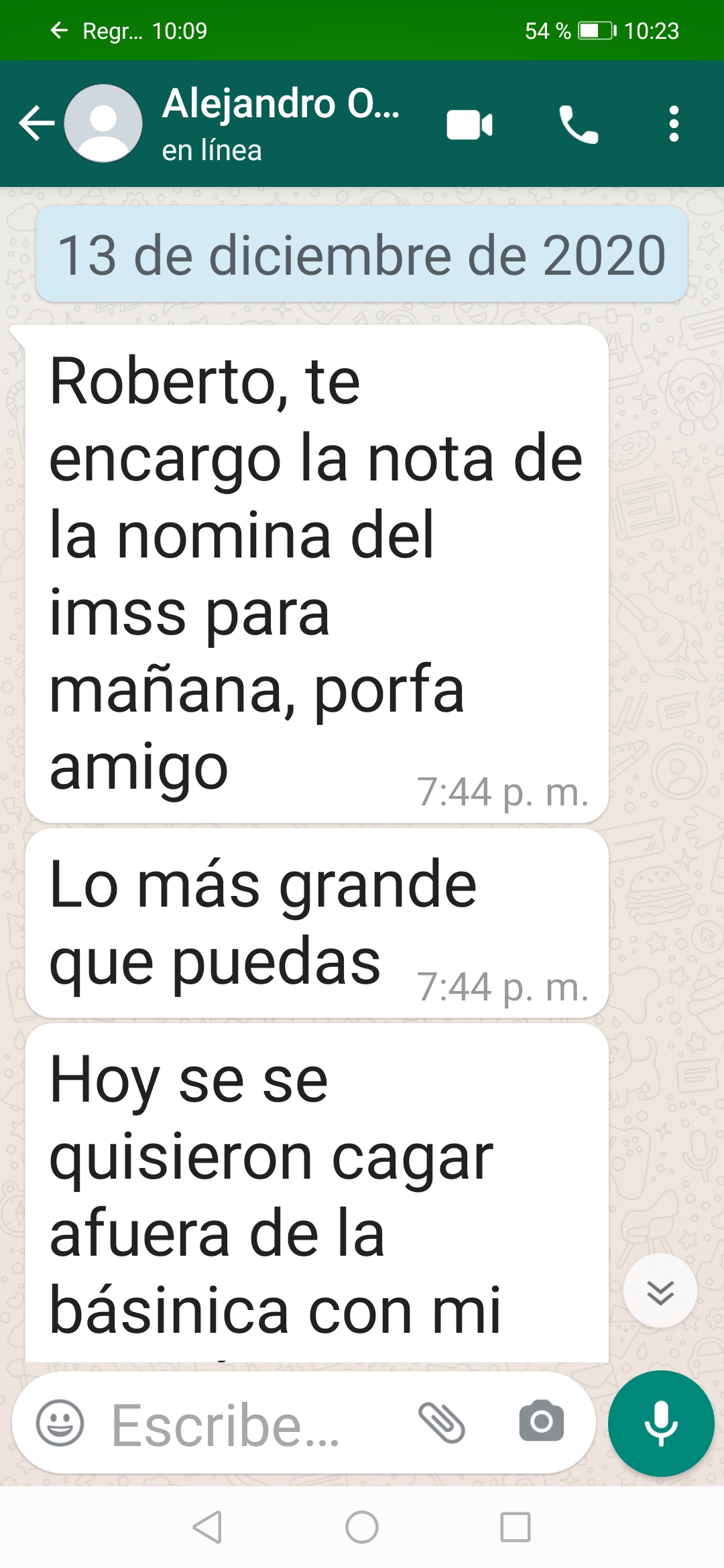 Inclusive, de ser necesario y para dar mayor crédito a mi palabra, entregaré a la FGR mi teléfono celular para que, a través de la Policía Cibernética, sea escaneado, hurgado pericialmente y se constate la autenticidad de los mensajes, de cuál número salieron, así como por ejemplo la nómina decembrina de todo el personal de la delegación y que como bien lo comentó el mercenario al cual me refiero, es un documento “confidencial” cuya filtración puso en peligro a sus propios compañeros trabajadores, toda vez que la delincuencia está a la orden del día..